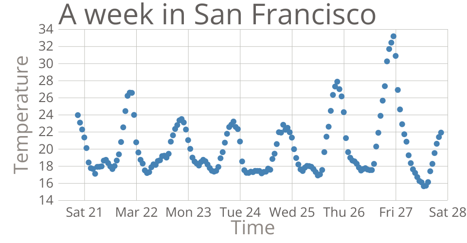 This scatter plot shows one week of temperature in San Francisco (in degrees Celssius).