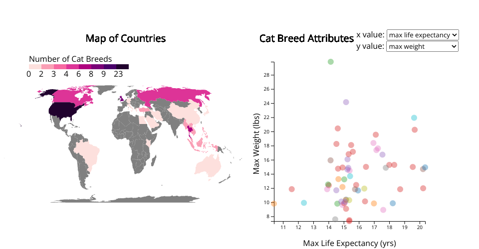 On the left is a world map with countries colored based on the number of cat breeds. This world map is zoomable and pannable using pinches and drags. On the right is a scatterplot of cat breeds graphed based on their max life expectancy and max weight.