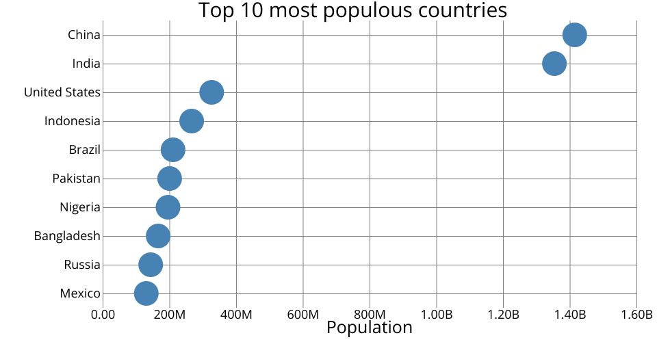 This bar chart shows population of the top 10 most populous countries. The data comes from the year 2018 estimate in United Nations: World Population Prospects 2017. It also demonstrates customization of D3 axes.