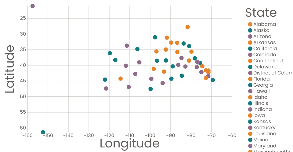 Steve's Scatter Plot of State Lats and Longs