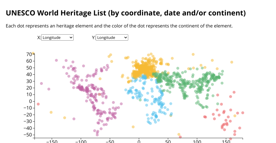 I downloaded a dataset with the list of Natural and Cultural Heritage Sites of around the world. The first 'view' is a scatterplot/map because the x-axis is longitude and the y-axis latitude (hoping to learn how to make a map soon).