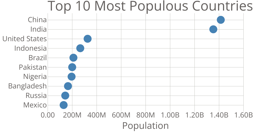 This bar chart shows population of the top 10 most populous countries. The data comes from the year 2018 estimate in United Nations: World Population Prospects 2017. It also demonstrates customization of D3 axes.
