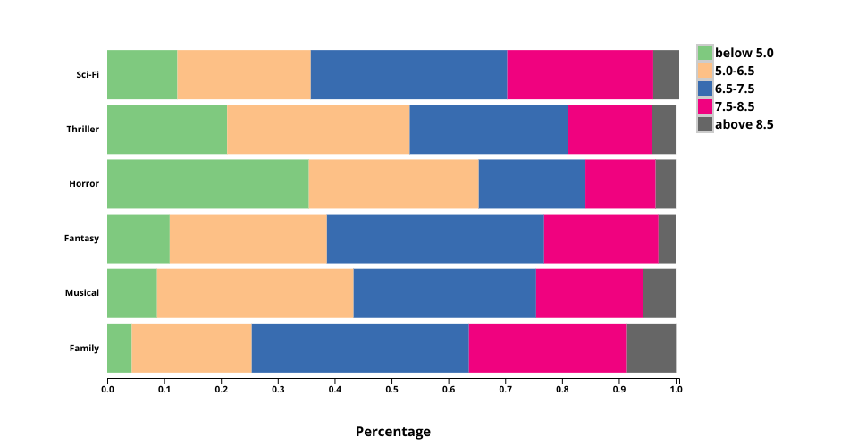 This stacked bar chart gives the percentage of each rating level within different movie genres. The aim is to show the impact of genre on movie ratings. When the mouse hovers over each bar, you can see pop-ups of accurate percentage of each rating level within each genre. Total percentage is 1, representing 100%.