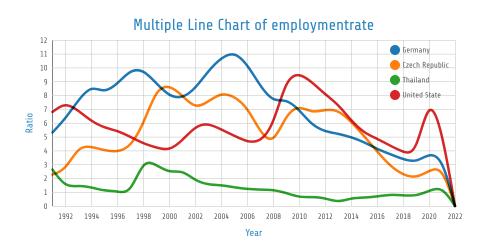 This line chart shows the employment rate of 4 differnt countries: Germany, Czech Republic, Thailand and United State. The data linked from github