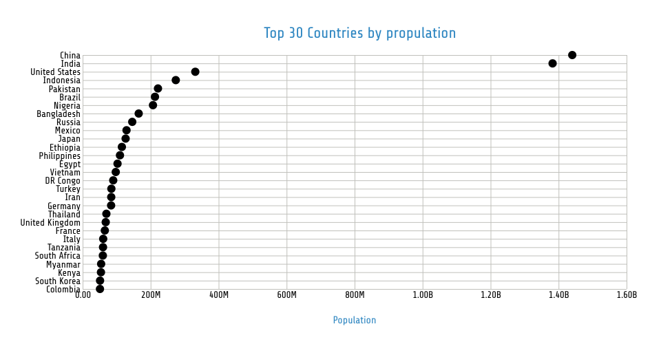 This scatter plots show population of the top 30 countries. The data comes from the year 2020 Kaggle: World Population Prospects 2020.