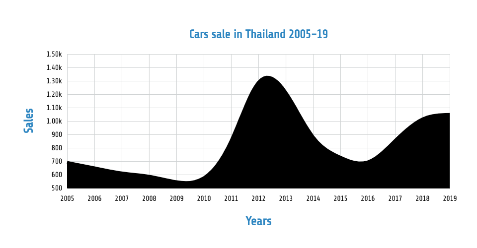 This line chart is the combinition of area chart and a line chart it shows the movement of car sales record of Thailand from 2005 to 2019. The data linked from github (Self generated dataset) [dataForclass-HW/dataset_aging.csv(https://raw.githubusercontent.com/chawinkk/dataForclass-HW/main/car%20sale%20record%20thailand.csv).