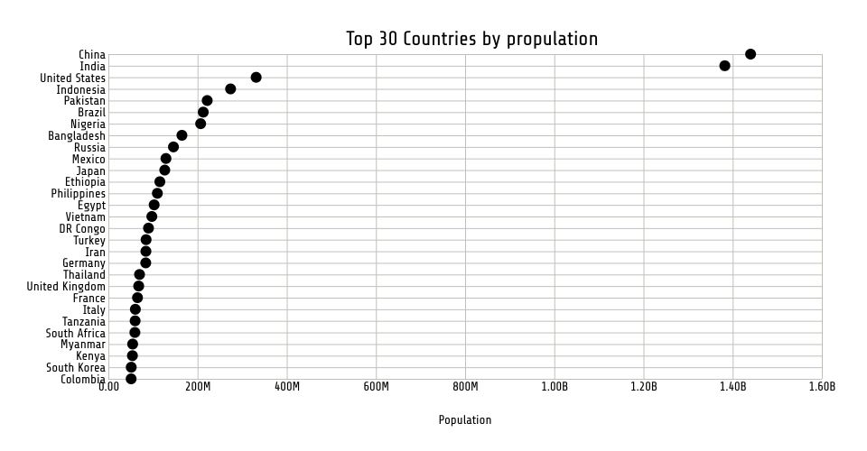 This bar chart shows population of the top 30 countries. The data comes from the year 2020 Kaggle: World Population Prospects 2020. It also demonstrates customization of D3 axes.