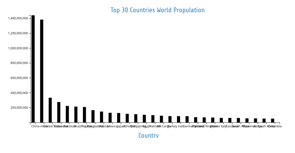 This bar chart shows population of the top 30 countries. The data comes from the year 2020 Kaggle: World Population Prospects 2020.