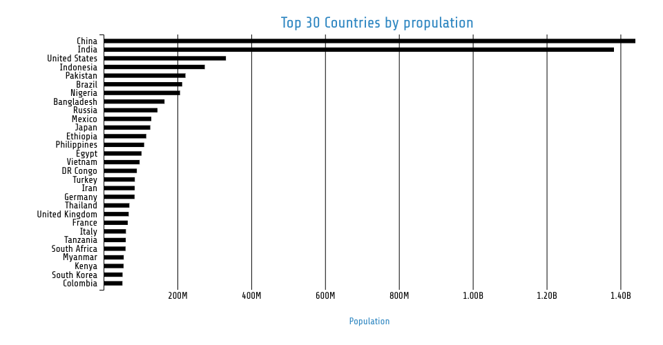 This bar chart shows population of the top 30 countries. The data comes from the year 2020 Kaggle: World Population Prospects 2020.