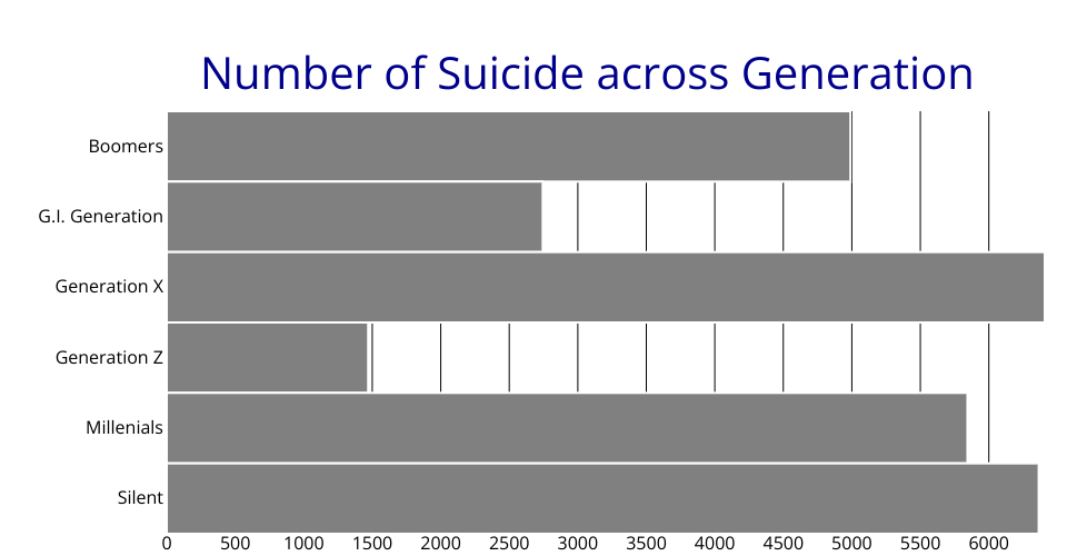 A program of bar charts that shows the suicide statistics versus demographic generation.