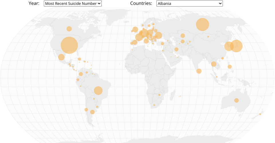 A world map showing suicide data provided by World Health Organization that has a drop down menu used to change the year.