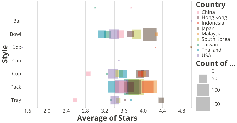 The X axis is the average of stars in that country. The Y axis is the categorical variables Style. The size of squares indicate the counting number of Ramen reviews in that country.