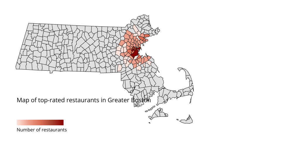 This map shows top restaurants distributions in GB area. Colors represents number of restaurants. Grey color is no data area, and red colors are cities with data (in Greater Boston area). A deeper red means a higher amount of top-rate restaurants. This is an interactive map that you can zoom in and hover over the cities of interests, and then the names and the numbers of restaurants will be shown in the tooltips.