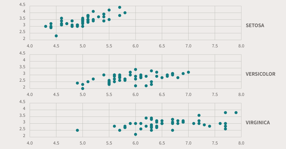 Sepal width (Y) vs. sepal length (X) of Iris flowers, grouped by species.