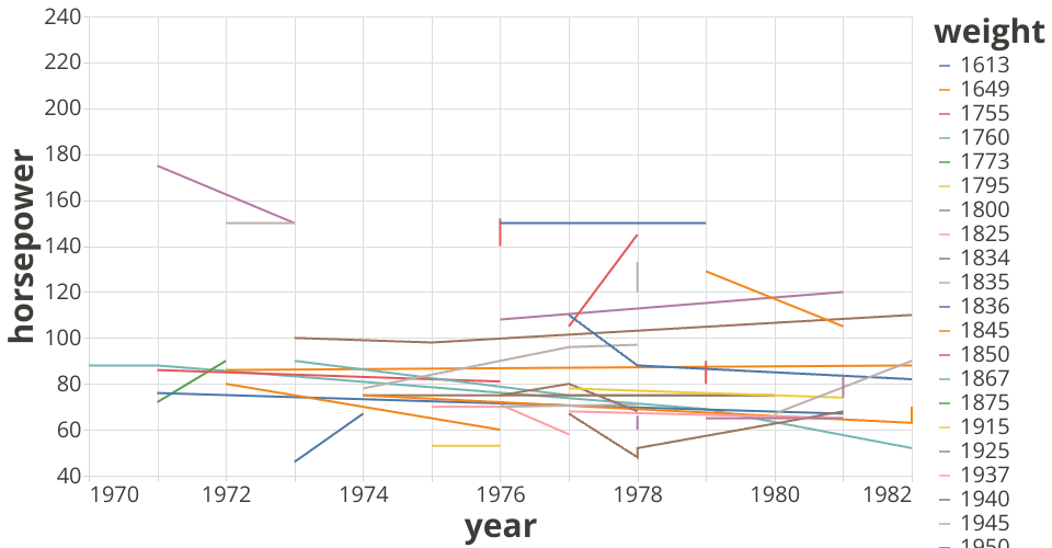 The data shown here comes from the UCI Machine Learning Repository: Auto MPG Data Set, via Gist: Scatter Plot with Menus.