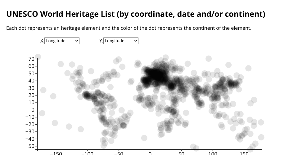I downloaded a dataset with the list of Natural and Cultural Heritage Sites of around the world. The first 'view' is a scatterplot/map because the x-axis is longitude and the y-axis latitude (hoping to learn how to make a map soon).