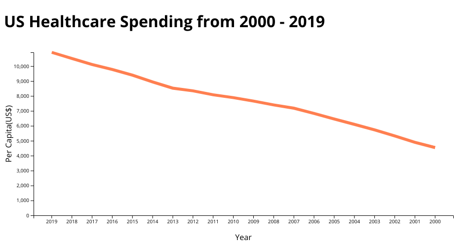 This line chart shows healthcare spending in US from 2000 to 2019 data. The data comes from (https://www.macrotrends.net/countries/USA/united-states/healthcare-spending).