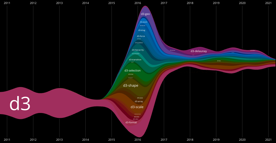 On the whole, one can see that development occurred in the original monolithic d3 repository from late 2010 to mid 2014. In late 2014 we see an explosion of packages, corresponding to the 4.0 release of D3. Since that great explosion, we see a big push on d3-delaunay in 2018, and ongoing development/maintenance work pretty evenly distributed across the various D3 packages.