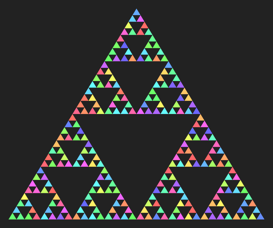 The triangle is drawn recursively with a depth of 5. Each smaller triangle is colored randomly with a bright hue.