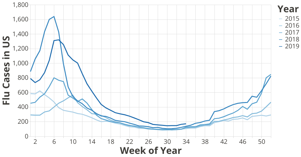 This graph shows the national ILI total cases annually. The curves from 2015 to 2019 to the present date are displayed. This plot achieves the visualization of the annual ILI total patterns in general, and also provide a direct comparison year-over-year. We can tell 2018 is the year with highest Flu cases in mid February time, while 2019 has a more stretched Flu season comparing to other years.