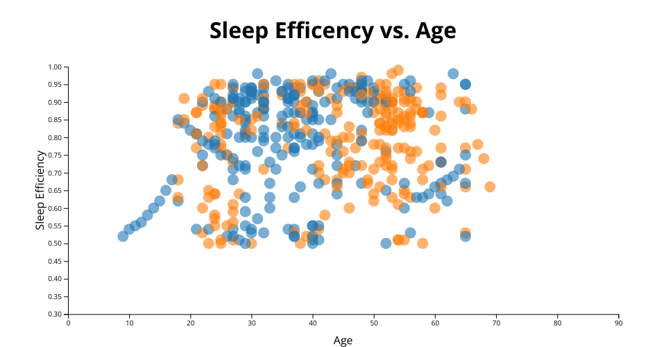 This is a viz on the sleep efficiency dataset. The question this viz aims to answer the question is sleep efficiency and age correlated? We can see that there is a linear relationship until about age 20, and then afterward, there is no relationship.