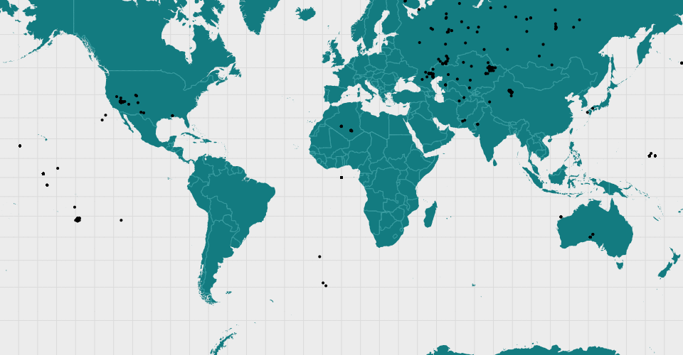 This is a visualization of the dataset Nuclear Explosions that shows where each deployments went off by latitute and longitude. The world map behind the points is a Mercator type map using the World Atlas TopoJSON. The points are off by a small fraction (down and to the left) however it fits much better on the Mercator projection over the Natural Earth projection. When the user hovers over each point, they can see the latitude and logitude of that deployment.