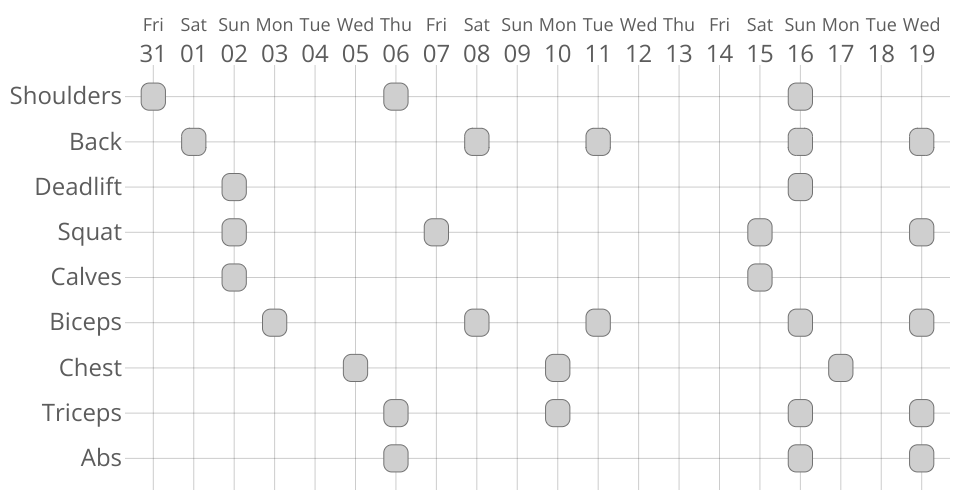 A functional tool for logging and visualizing short term resistance training history. The idea is to use this to know what muscle to train next, keeping in mind ideally a minimum 2 day rest period for each.