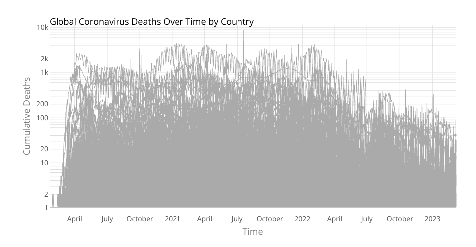 Line chart of Coronavirus cases to date, by country. Data from Johns Hopkins Coronavirus Dataset.