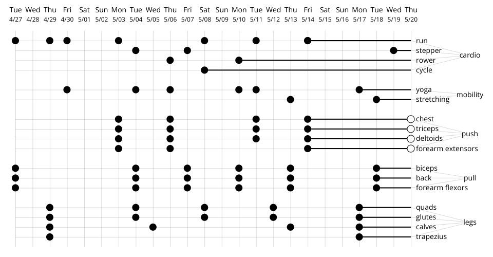 A tool to keep track of personal exercise activities. This was created to facilitate a dynamic personal exercise program such that muscles are not overtrained, not undertrained, and there is no need to stick to a fixed split routine. The idea here is that when I feel like exercising, I can look at this to see what muscles I have not exercised for a while, and also which ones I did exercise recently, to inform my decision in terms of what to do next.