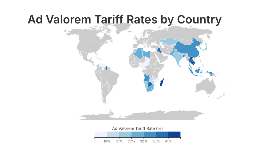 This visualization displays a choropleth map of Ad Valorem Tariff Rates by country.
