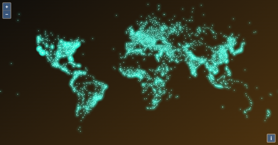 Each point is a city with population greater than 50,000. City data from Simplemaps: World Cities Database. Data loading logic drawn from Sized Points on a Map.
