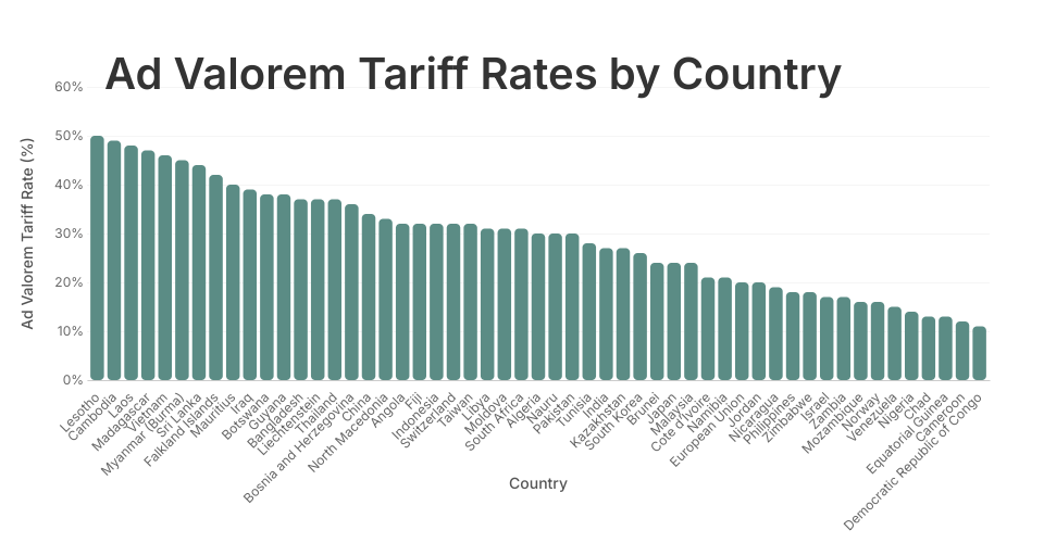 The data here was copied directly from the original article: U.S. imposes 10% baseline tariffs; higher reciprocal tariffs for targeted countries by Reed Smith.