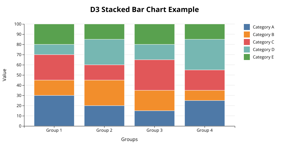 This is a simple example that demonstrates how to create a stacked bar chart using D3.js. The visualization includes: