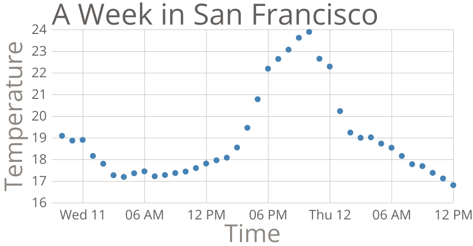 This scatter plot shows one week of temperature (in degrees Celcius) in San Francisco. The data comes from Data Canvas - Sense Your City.