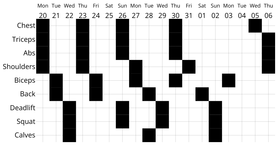 A functional tool for logging and visualizing short term resistance training history. The idea is to use this to know what muscle to train next, keeping in mind ideally a minimum 2 day rest period for each.
