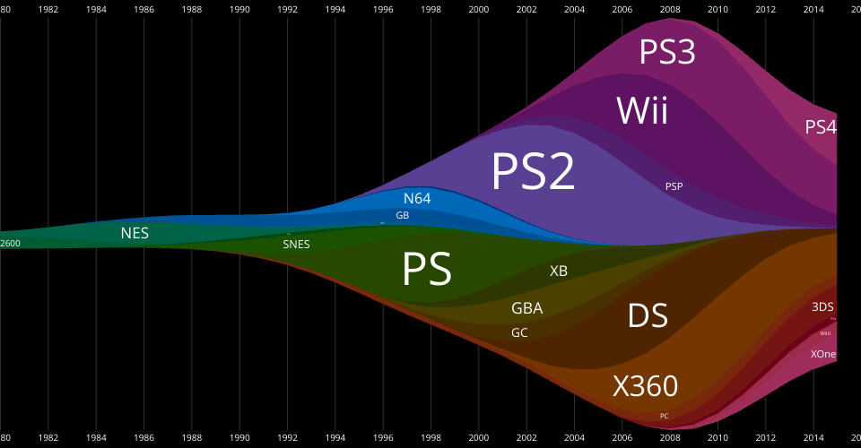 This is a streamgraph visualizing this Video Game Dataset. It is meant to show the relative Global Sales of games for each console over the years.