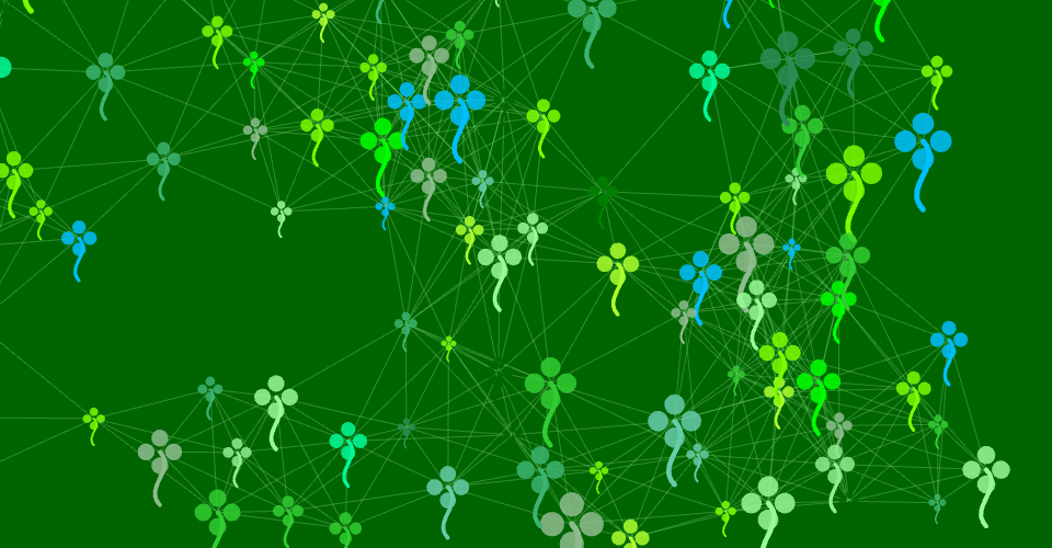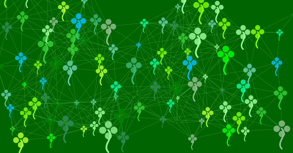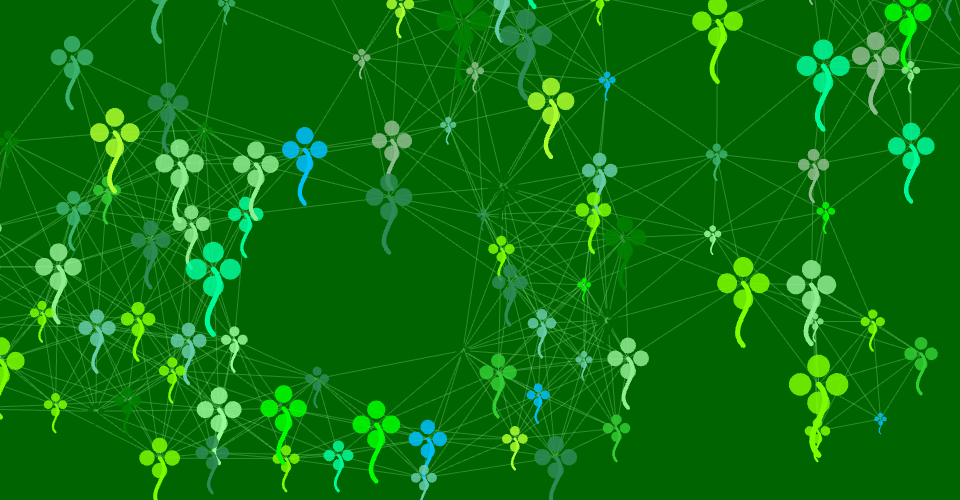 Green four-leaf clovers move around the screen and create connections with nearby clovers. Each clover has a stem attached to it, making them look more natural.