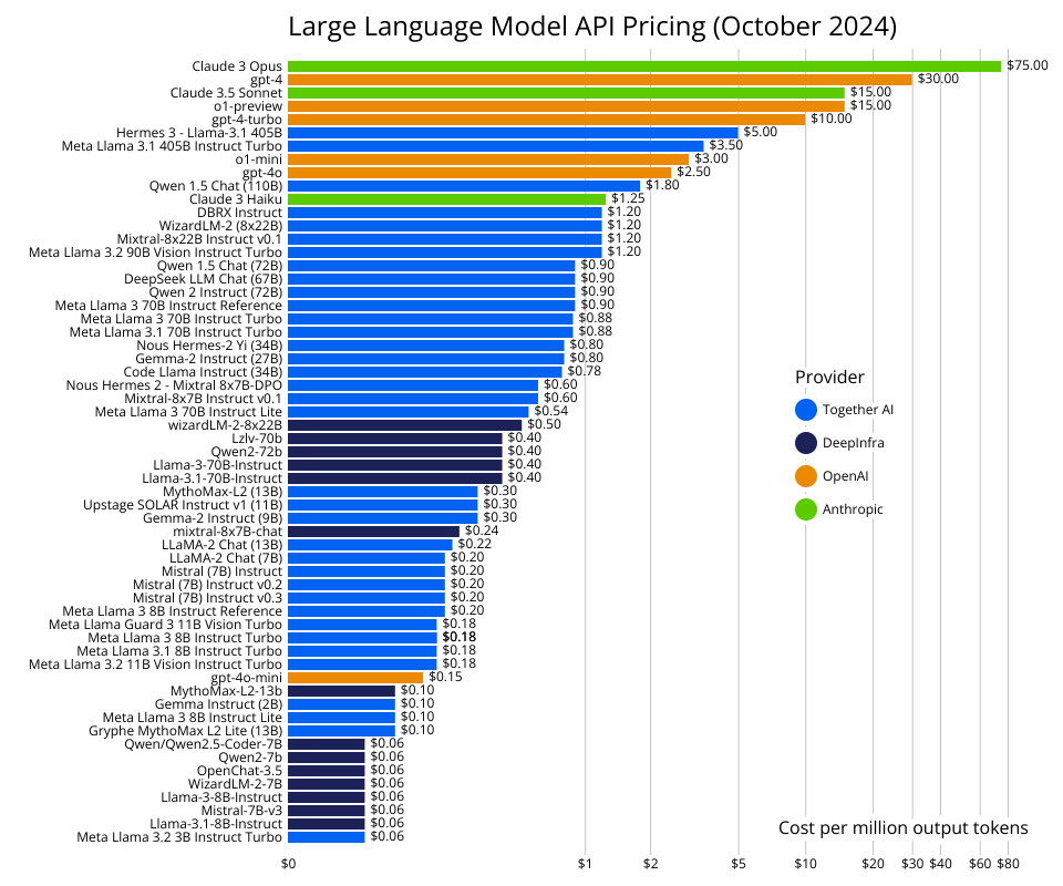 Shows the cost per token across a few LLM API providers: