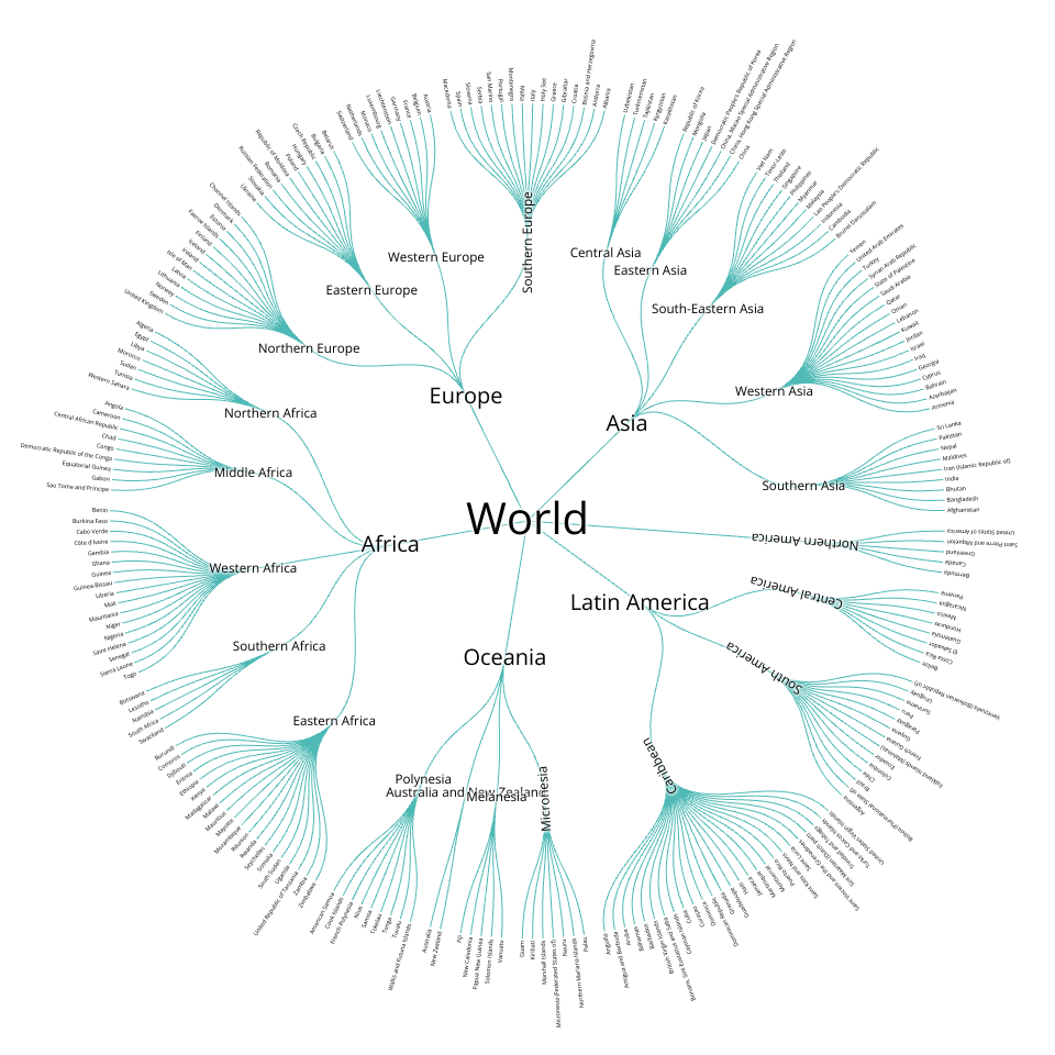 A D3.js visualization showing countries organized in a radial tree layout.