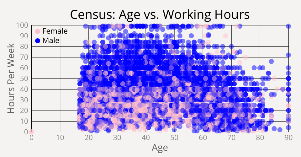 This chart shows the working-hours of working-class people in comparison with their age and gender. The data comes from the Census Income Data Set extracted by Barry Becker in 1996 from the 1994 Census database.