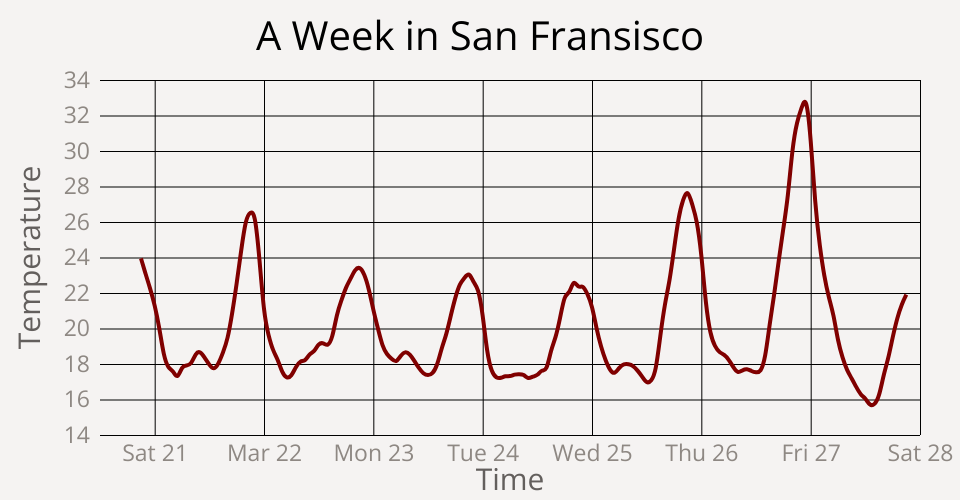 This scatter plot shows one week of temperature (in degree Celcius) in San Fransisco. This data comes from "Data Canvas: Sense Your City".