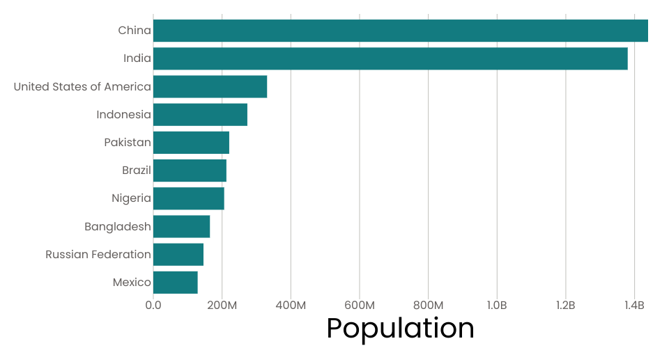 A program that shows the top 10 most populous countries as a pathetic bar chart with no axes.