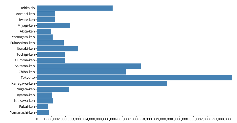 This barchart shows population of the east j most populous prefs.. The data comes from the year 2020 estimate in Unaited Nations:World Population Prospects 2020