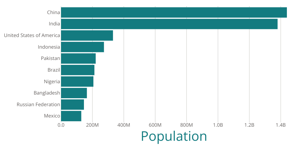 A program that shows the top 10 most populous countries as a pathetic bar chart with no axes.