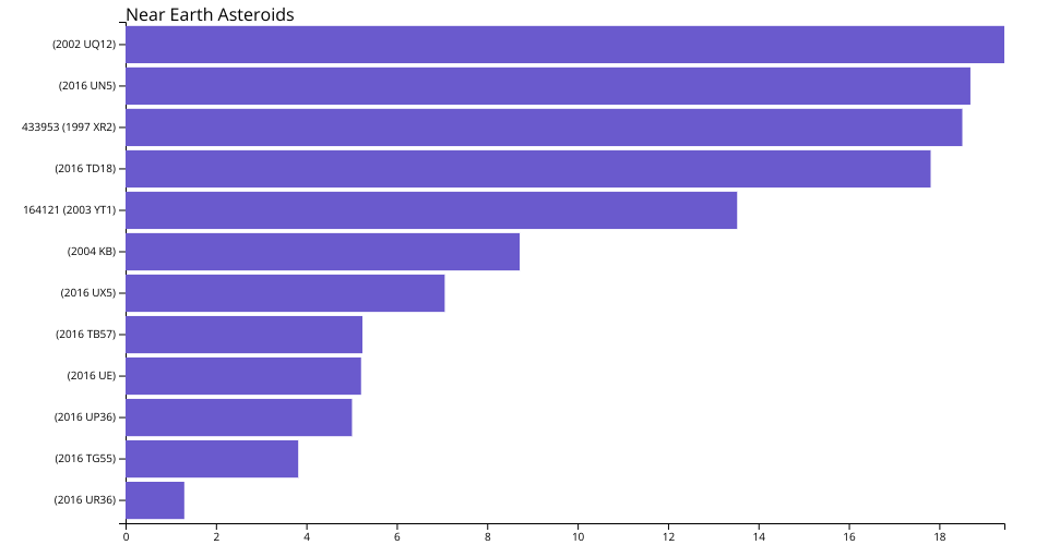 This bar chart illustrates distance minimum of tracked Near Earth Asteroids that have made a close approach within the last 12 months. Data Set: "Future Asteroids" by Marc Di Marco Data source: https://data.world/markmarkoh/future-asteroids