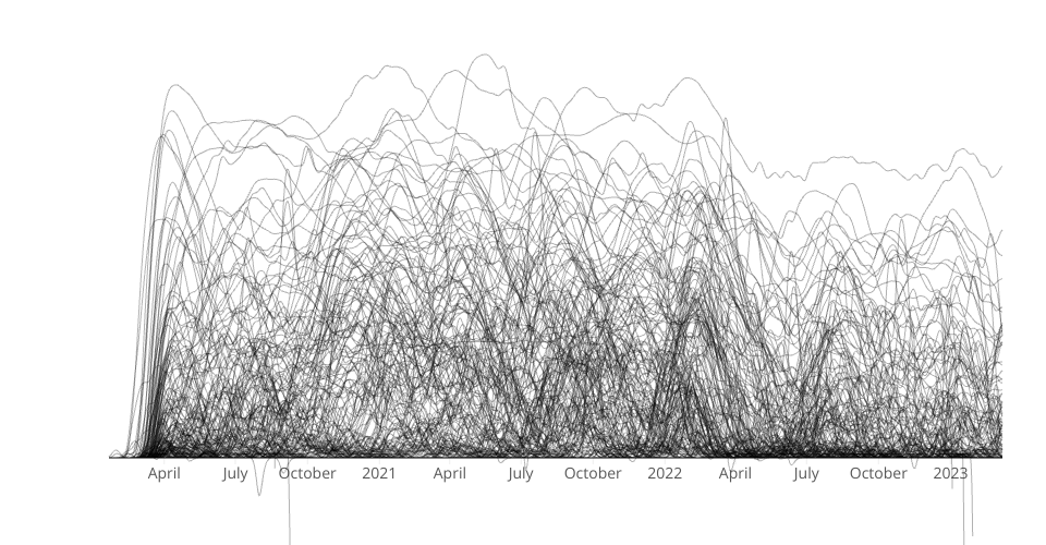 This variant shows daily death numbers, smoothed using the repeated averaging technique described in D3: Histogram Blur / Smoothing.