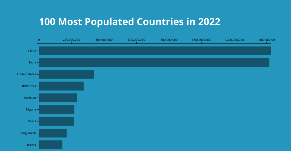 This bar chart shows the 100 most populated countries in 2022 sorted from highest to lowest (top to bottom). The source comes from worldpopulationreview.com