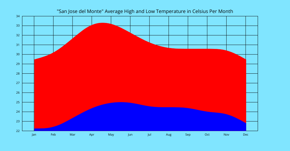 Average High and Low Temperature in San Jose del Monte By Month Area Chart