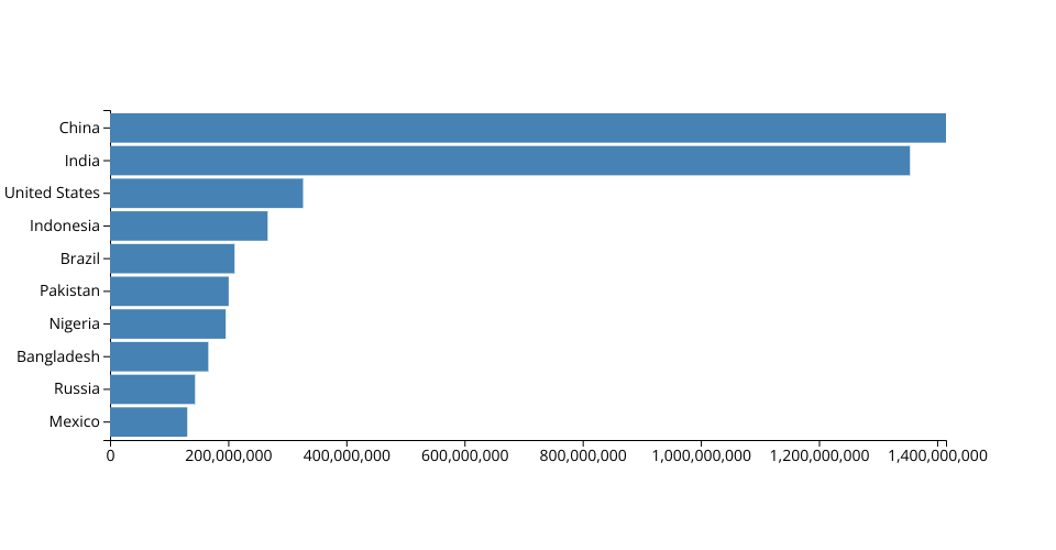 This bar chart shows population of the top 10 most populous countries. The data comes from the year 2018 estimate in United Nations: World Population Prospects 2017.