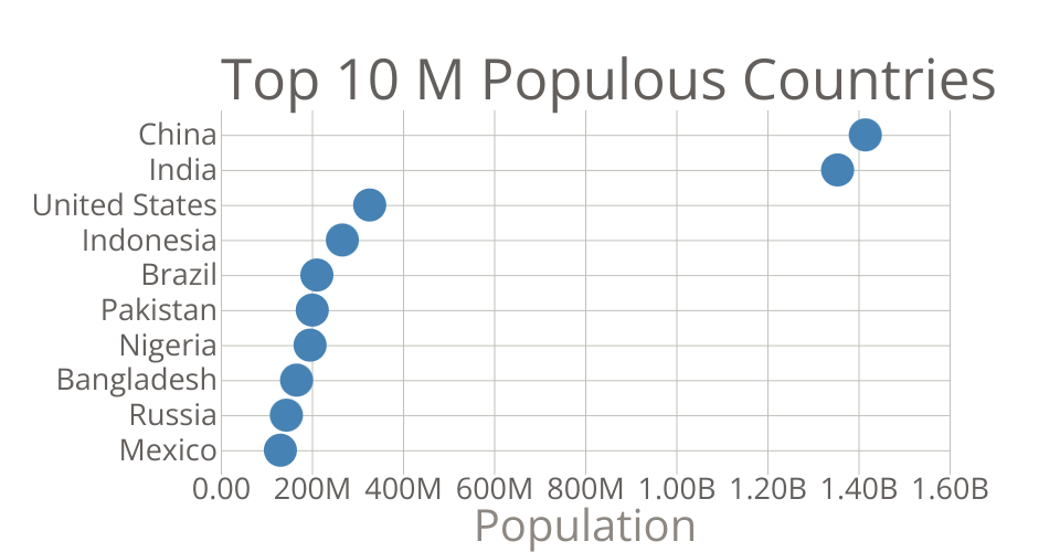 This bar chart shows population of the top 10 most populous countries. The data comes from the year 2018 estimate in United Nations: World Population Prospects 2017.